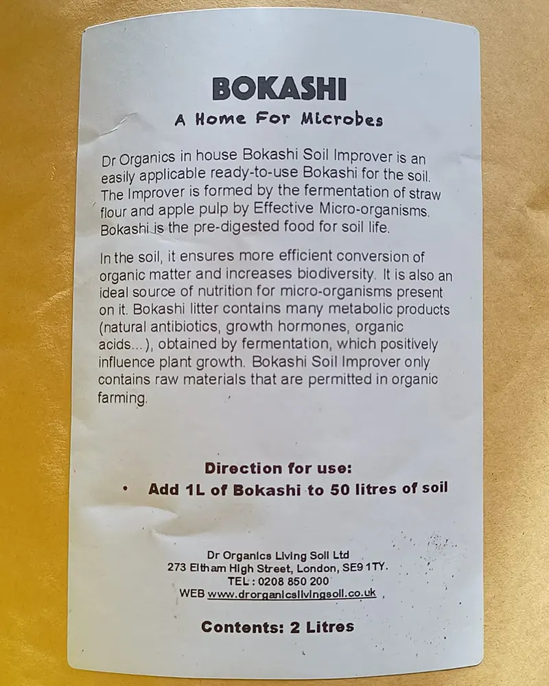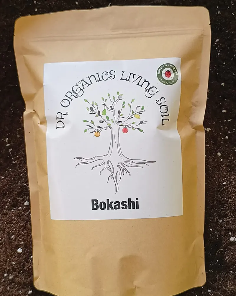 Add 1L of Bokashi to 50 litres of Dr Organics living soil at the start of your grow . When reusing and reamending Dr Organics living soil with our 4 3 4 dry amendment add 1 litre of Bokashi per 50 litres of soil.